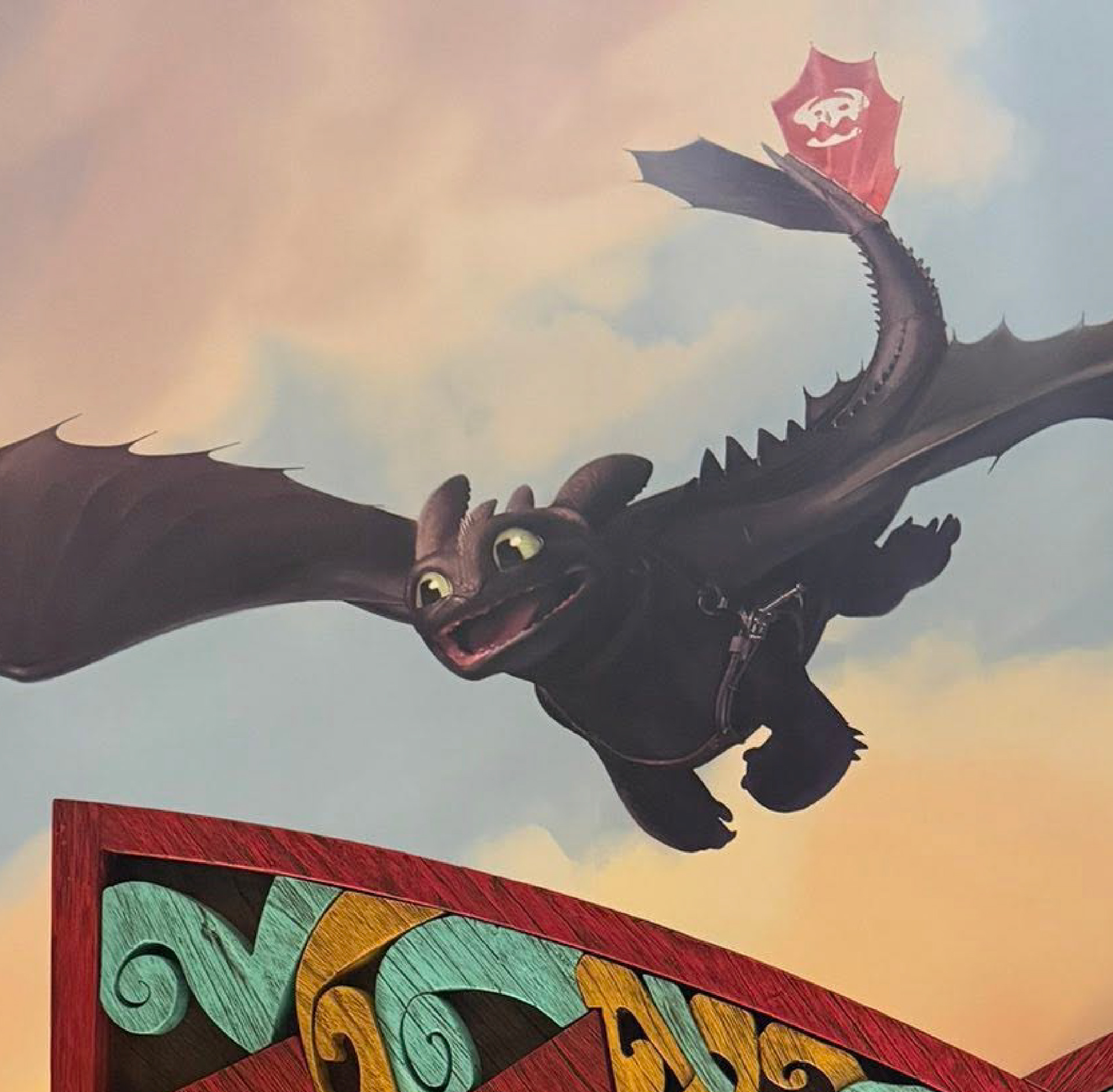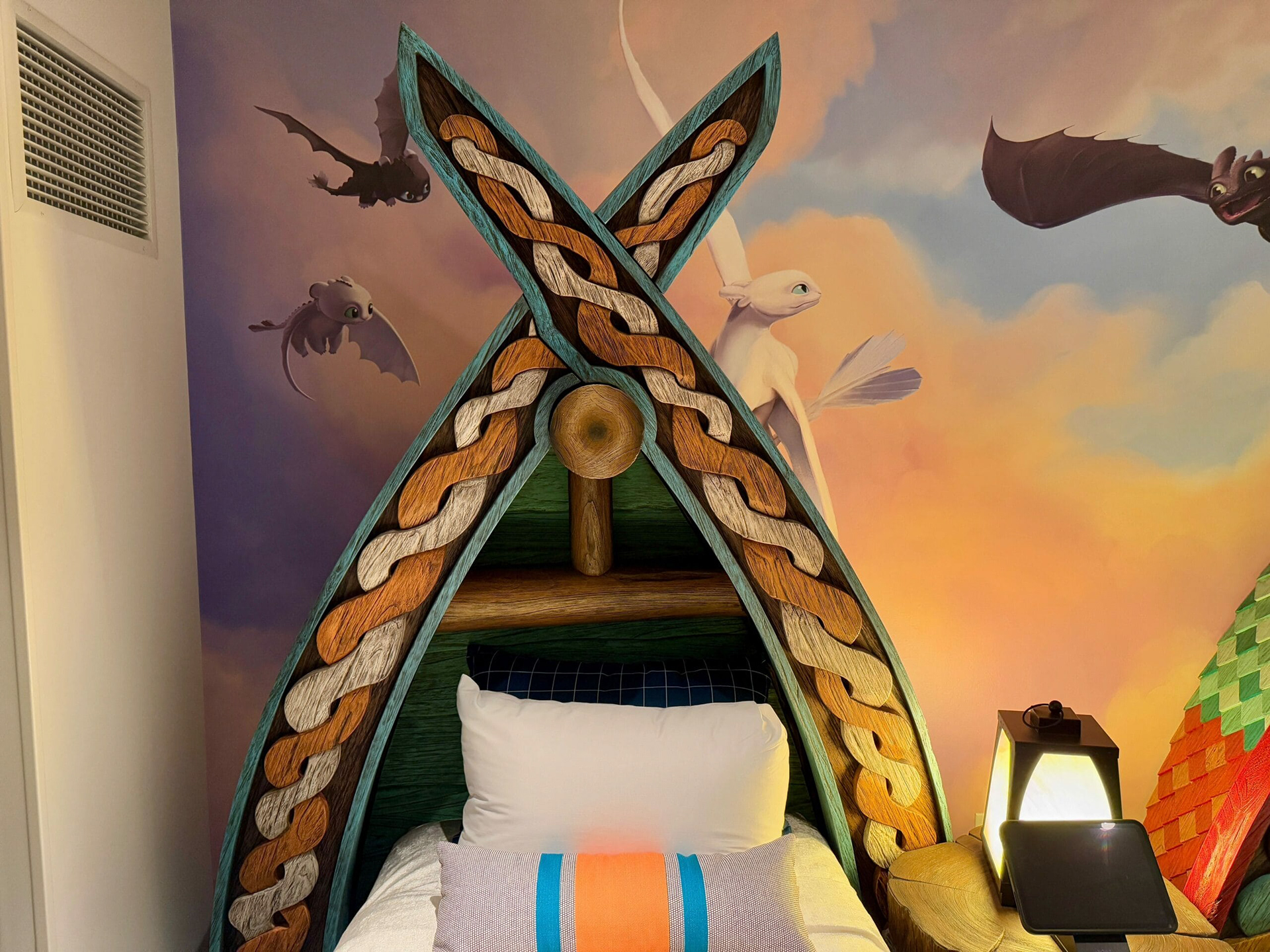 Selected publicly released photos of Epic Universe's Helios Grand Hotel's How To Train Your Dragon Kids' Suite showcasing the mural I illustrated.